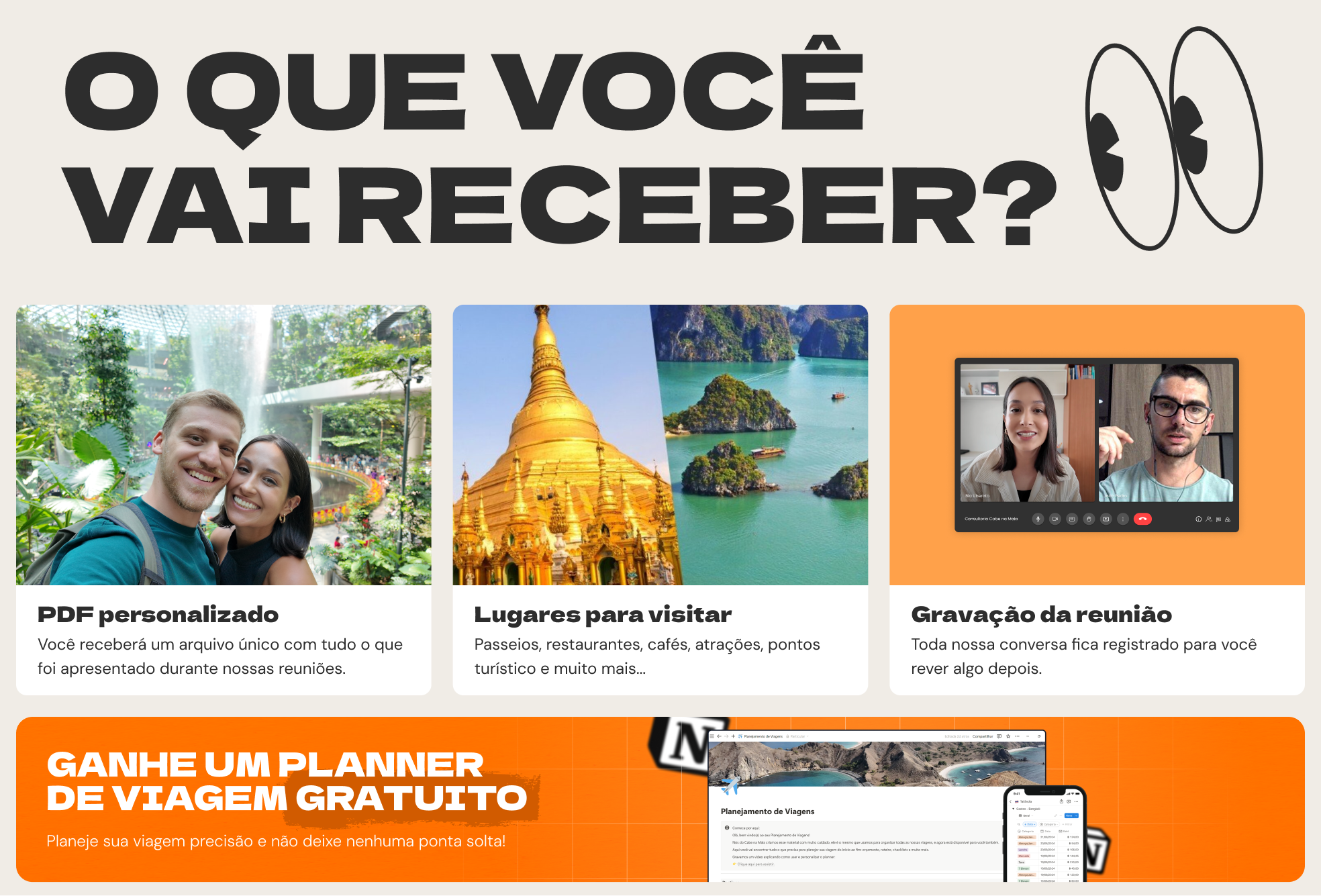 Formulário inicial: você preenche um breve questionário para nos contar sobre sua viagem, estilo, interesses e dúvidas. Após o preenchimento, pedimos até 1 semana para preparar ummaterial personalizado com base nas informações que você nos enviar